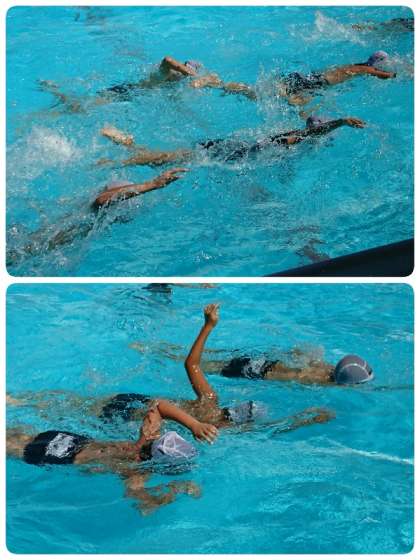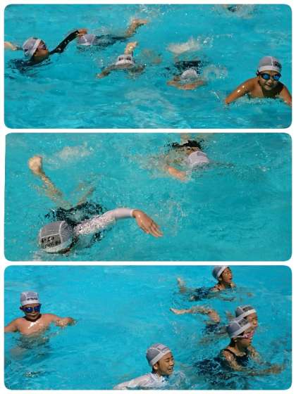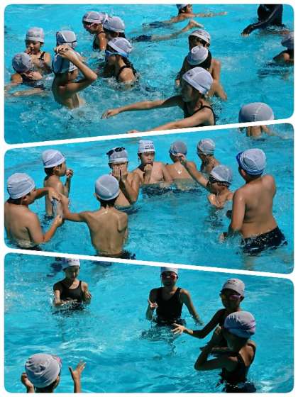 4年生も25mを自分のペースで泳ぎました。日頃の水泳学習をがんばってきたご褒美に、いつもよりたくさん自由練習の時間をもらいました。子ども達は歓声をあげていました。ルールを確認してプールに入り、おにごっこをして遊んでいる子どもが多く見られました。