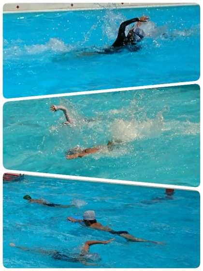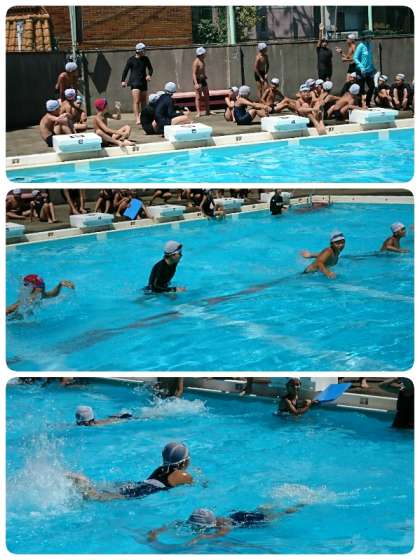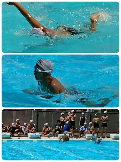 6年生は、学年で全員リレーを楽しみました。6コースに分かれ、最初は25mを走る子ども、次はバタ足で25m泳ぐ子ども、その次はクロール・平泳ぎで…アンカーはクロールで50m泳いでいました。スイスイ泳いでトップでゴールしたチームは大喜びでした。最後にゴールをしたアンカーも素晴らしい泳ぎを見せていました。みんなの応援の声がプールに響き、そしてゴール!!