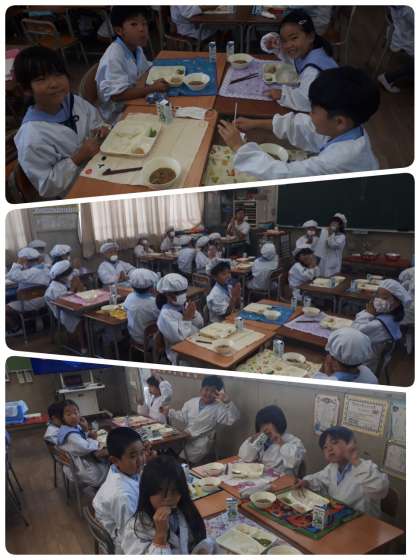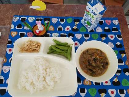 今日の給食は、ごはん、牛乳、マーボーなす、もやしのごま酢あえ、えだまめでした。マーボーなすは、なすがとろっとしていて、おいしかったです。もやしのごま酢あえは、さっぱりとしていました。えだまめは、豆がぷりっとしていました(*'▽')