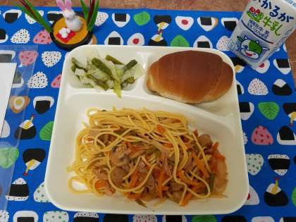 今日の給食は、パン、牛乳、イタリアンスパゲッティ、グリーンアスパラガスとキャベツのサラダでした。イタリアンスパゲッティは、ウインナーなど入っていて、子ども達に大人気でした。グリーンアスパラガスとキャベツのサラダは、アスパラガスが柔らかくて食べやすかったです