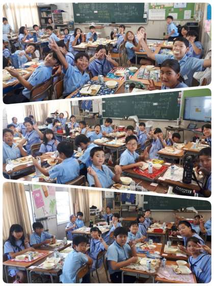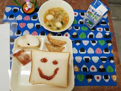 今日の給食は、パン、牛乳、あげぎょうざ、中華煮、なし(豊水)、いちごジャムでした。あげぎょうざは、カリッとあがっていました。中華煮は、キャベツ、玉ねぎ、チンゲンサイなどたくさん野菜が入っていました。なし(豊水)は、水水しかったです(≧▽≦)