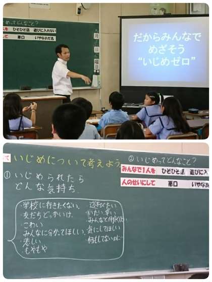 4年生は、道徳「いじめについて考えよう」という学習をしました。けんかといじめのちがいを「1回」か「何回も」か、「偶然」か「わざと」かなど比較しながら、子ども達に考えさせていきました。「いじめゼロ」にする為には、どうしたらよいか4年生の子ども達なりに真剣に考えることができました。