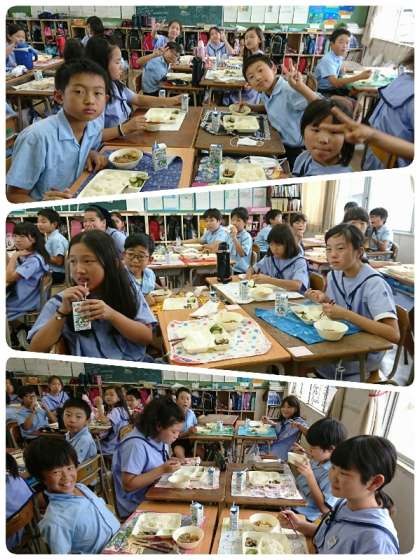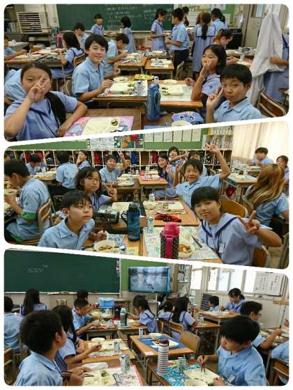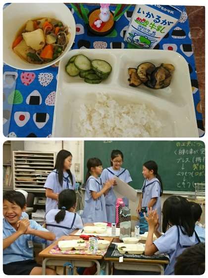 今日のメニューは、肉じゃが・焼きなすのみそだれかけ・あっさりきゅうり・ごはん・牛乳でした。肉じゃがは、ジャガイモがほくほくしていて、味が中までしっかりしみておいしかったです。焼きなすのみそだれかけは、みそだれがよく絡んでいてごはんが進む一品でした。5−2では[いただきます]の時に、明日誕生日を迎えるお友達にカードをプレゼントしていました。5−3では、今日の団体演技を撮影した映像を大型TVに映してもらい、自分達の動きを確認ていました。真剣な顔をして食べていましたよ。今日もおいしくいただきました。