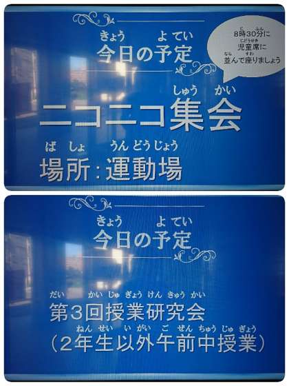 5時間目に2年生の学級で授業研究を行いますので、1・3〜6年生は午前中授業で、下校は13:30〜13:40になります。2年生は5校時終了後、14:45頃下校します。