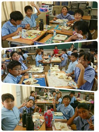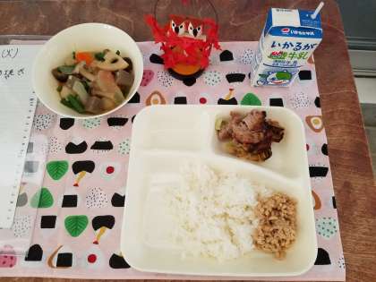 今日の給食は、ごはん、牛乳、豚肉のねぎじょうゆ焼き、ふきよせ煮、ツナ大豆そぼろでした。豚肉のねぎじょうゆ焼きは、ねぎ醤油だれがおいしかったです。ふきよせ煮は、さといもが甘くて、柔らかい食感がよかったです。ツナ大豆そぼろは、子ども達に大好評でした。