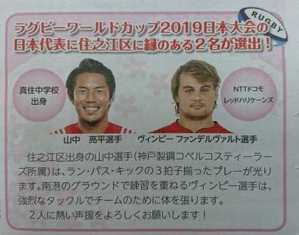 ラグビーワールドカップ2019日本大会に日本代表の選手として活躍している山中亮平選手は、住吉川小学校の出身です。真住中学校でラグビーと出会い、今は神戸製鋼コベルコスティーラーズに所属しています。先日のアイルランド戦でも大活躍でした。