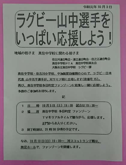 先日HPでもお知らせしましたが、10月5日(土)対サモア戦に山中亮平選手が出場します。背番号は15。みんなで応援しましょう!!