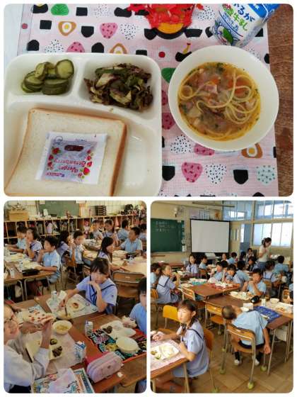 今日の給食は、パン、牛乳、牛肉のカレー風味焼き、トマトのスープスパゲッティ、きゅうりのピクルス、いちごジャムでした。牛肉のカレー風味焼きは、子ども達に好評で、おかわりをする児童がたくさんいました。トマトのスープスパゲッティは、にんにくやオリーブ油の香りがよく、おいしくいただきました。きゅうりのピクルスは、あっさりとしていました(*^^*)