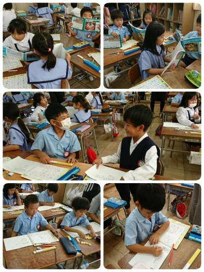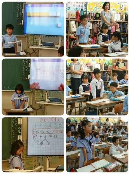 2時間目、1−1で、算数の公開授業を行いました。単元は「たしざん」です。今日の問題は、「○○せんせいはどんぐりを7こ、□□せんせいは4こひろいました。あわせてなんこひろいましたか。」で、繰り上がりのあるたし算の仕方を考えました。この学習活動に子ども達はずいぶん慣れてきて、とてもスムーズに学習が進んでいきました。よく手を挙げ、みんなによく聞こえる声で発表し、意欲的に取組んでいました。日々の学習の成果が出ているなと感心しました。子ども達はとってもがんばっていました。素晴らしかったです。