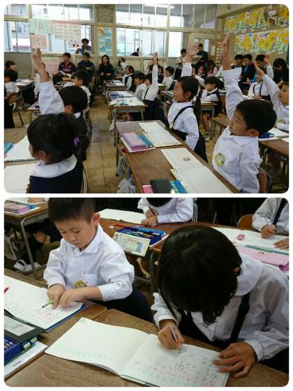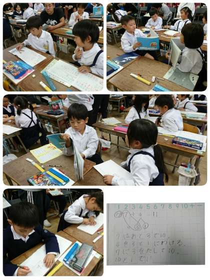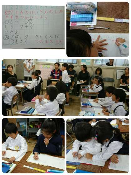 5時間目、1−2の学級で算数の研究授業を行いました。単元は、「たしざん」で、くり上がりのある加法について学習しました。1−2の子ども達は、ほとんどの子どもが自信を持ってどんどん発表することができていました。ノートを書く字がていねいで、まるでお手本のようです。書くスピードもとても速いです。1年生でこれだけできるのは、日頃の学習規律がしっかりと身についているからですね。