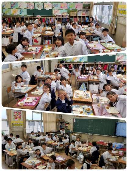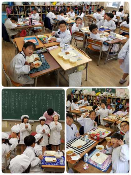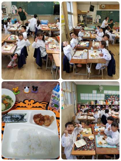 今日の給食は、ごはん、牛乳、みそカツ、じゃがいもと野菜の煮もの、焼きのりでした。みそカツは、みその甘だれがカツによく合っていて、子ども達も「おいしい。」と言って食べていました。じゃがいもと野菜の煮ものは、玉ねぎやにんじん、三度豆など野菜がたっぷり入っていました。焼きのりは、ごはんが進みました(*^^)v