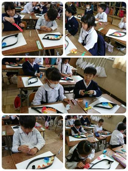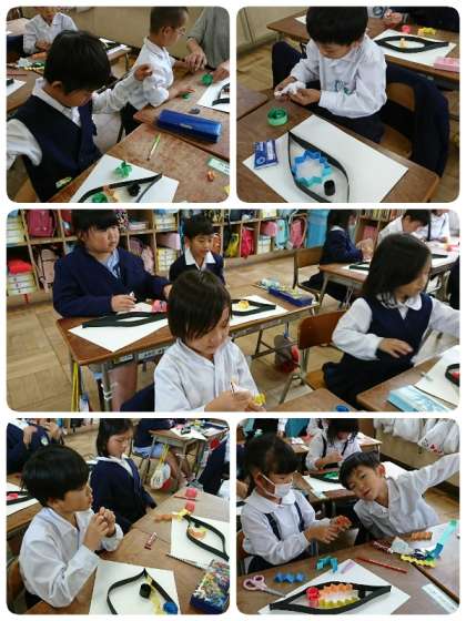 1年生の子ども達が、図画工作の時間に紙工作用のデザインペーパーを使って「ふしぎな さかな」を作り始めました。細長く切ったデザインペーパーをジャバラ折りにしたり、鉛筆を使ってくるくると渦巻きにしたりと、自分でいろいろ考えながら工夫して工作をしていました。紙工作用のボンドを使うと、のりしろがなくても平面に垂直に紙を貼ることができます。子ども達の様子を見ていると、とっても楽しそうに学習に取組んでいました。子ども達のいきいきした顔は最高です。どんな色とりどりの作品に仕上がるのかなと期待しています。