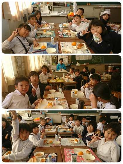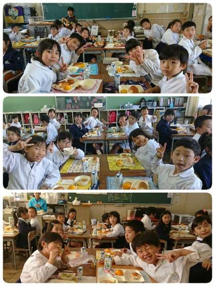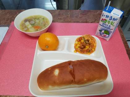 今日の給食は、さつまいもパン、牛乳、豚肉とキャベツのスープ煮、変わりピザ、みかんでした。豚肉とキャベツのスープ煮は、キャベツやじゃがいも、にんじん、玉ねぎ、グリンピースなど野菜がたっぷりでおいしかったです。変わりピザは、子ども達に好評でした。みかんは、甘くてジューシーでした(^O^)/