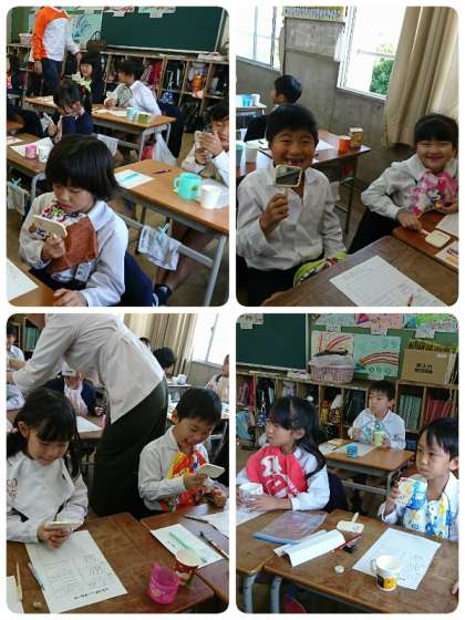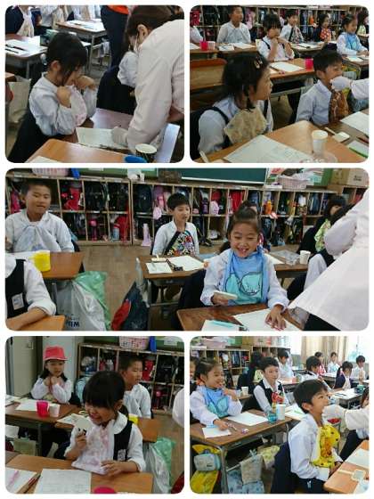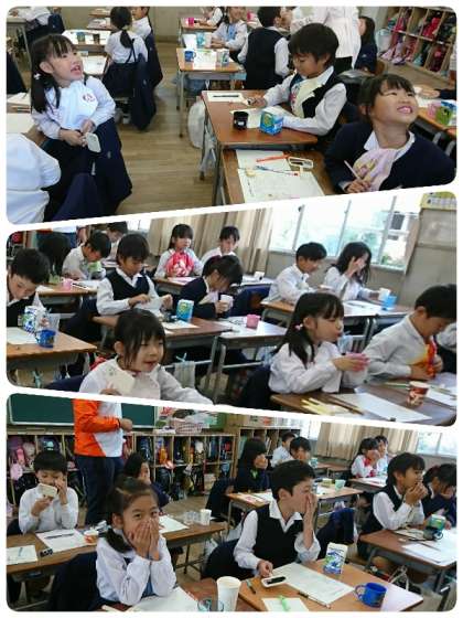 観察してから、次は歯みがきです。1分間、しっかりみがきました。もう1度、みがいた歯に液をつけてもらいました。今度は赤く染まりません。舌でさわってみると「つるつるしてる。」と、うれしそうに感想を言っていました。さっそく今晩からの歯みがき、がんばってね。