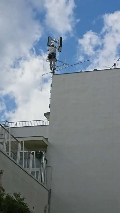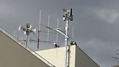 昨日から住吉川小学校の屋上にある防災無線の取り換え工事をしています。高所での作業なので見ているだけでドキドキです。