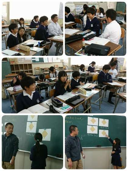 5時間目、4−2で算数科「計算のやくそくを調べよう」の単元で公開授業を行いました。今日のめあては、「ドットの数の求め方を1つの式に表すにはどうするか考えよう」です。問題のドットの絵を見て、同じ数のまとまりをみつけたり、ドットを移動させたりして計算の方法を工夫して考えました。
