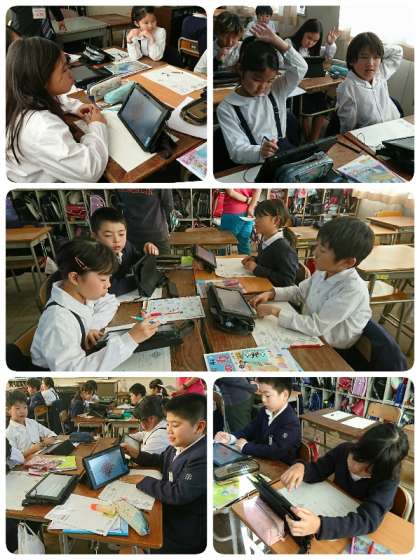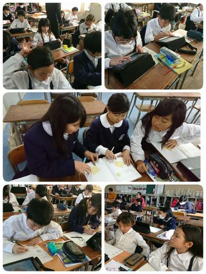 タブレットを操作して、ドットを同じ数ずつ囲み、どのように式を立てたら簡単に計算できるのか、いろいろな方法で考えました。自分で考えた方法をワークシートにも書きました。ペアやグループで話し合ってそれぞれの意見を共有し、全体の場でも発表しました。4−2の子ども達はすごく落ち着いていて、よく考えて学習していました。花丸です。