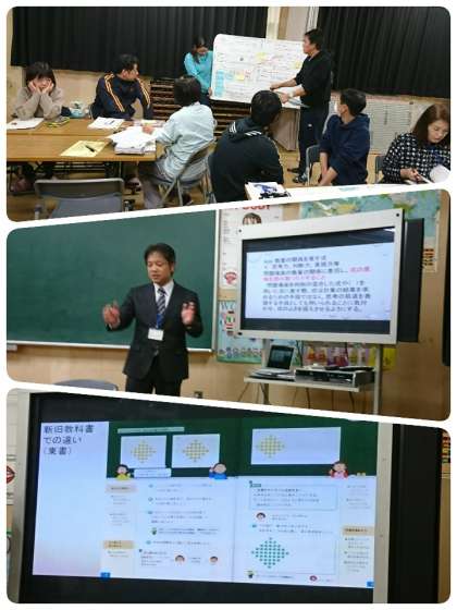 研究授業の後に研究討議会を行いました。今日の授業についてグループ討議をして、それぞれのグループで話し合った内容については全体でも交流しました。加賀屋東小学校の校長先生に指導に来ていただきました。来年度に変わる学習指導要領や新しい教科書の内容にもふれながら、具体的に教えていただきました。本当にいつもありがとうございます。