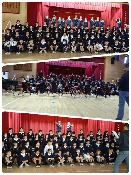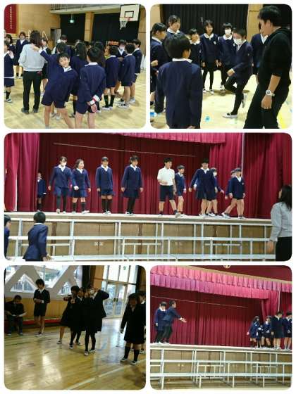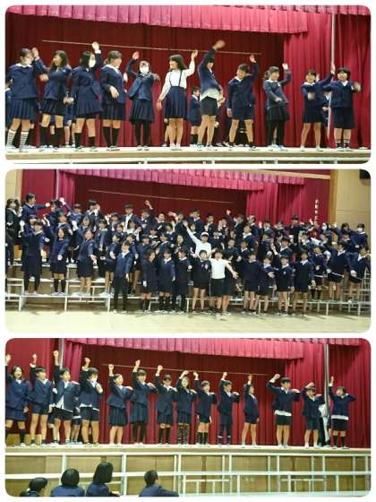 上の写真は5年生「劇・合唱 食べ物はどこから」、下の写真は6年生「歴史劇 過去から未来へ−いざ進もう−」の様子です。5年生の声に圧倒されました。ことばを何度も重ねていく場面があるのですが、すごい迫力でした。なかなか見物ですよ。6年生は場面ごとに分かれて自分達で練習した後に、全体の動きを確認しながら舞台を使ってフィナーレの練習をしていました。ミュージカル風で、この間来ていただいたOSKのみなさんの動きを取り入れているような場面もありました。さすが高学年です。