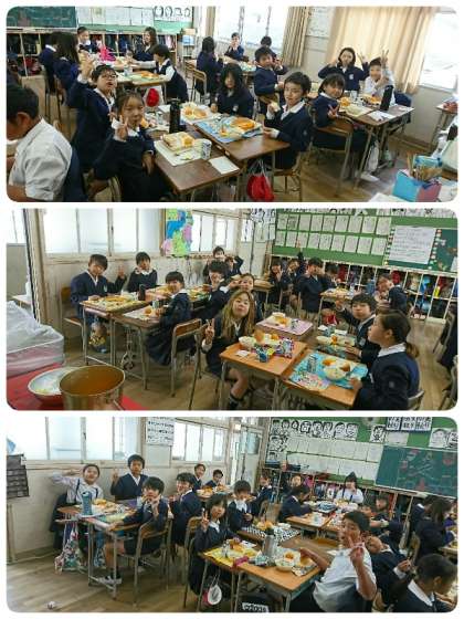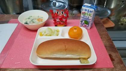 今日の給食は、パン、牛乳、ほたて貝のクリームシチュー、キャベツとコーンのサラダ、みかん、バターでした。ほたて貝のクリームシチューは、煮込まれた野菜が柔らかく、ホタテがクリームと合っていました。キャベツとコーンのサラダは、コーンがアクセントになっていました。みかんはジューシーでした(^^♪