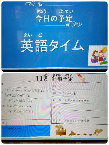 今日の予定は、朝の学習で英語タイムがあります。寒くなってきました。熱でお休みの連絡が増えています。病院でインフルエンザと診断された場合は、ご連絡よろしくお願いします。