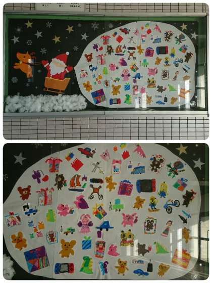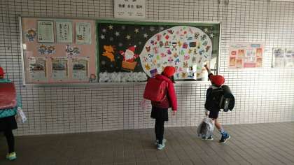 12月に入り、1年生が作ったかわいい掲示物に変わりました。サンタさんの袋には、かわいいプレゼントがいっぱい入っています。登校してきた子ども達がさっそくプレゼントを見ながら楽しそうに話をしていました。