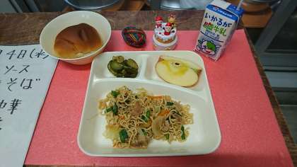 今日のメニューは、オイスターソース焼きそば・きゅうりの中華あえ・りんご・パン(1/2)・牛乳でした。オイスターソース焼きそばは、具だくさんでコクがあり、とってもおいしかったです。おかわりの行列ができていました。きゅうりの中華あえは、いりごまとごま油の風味でこれもおいしかったです。りんごは、蜜が入っていました。今日もおいしくいただきました。