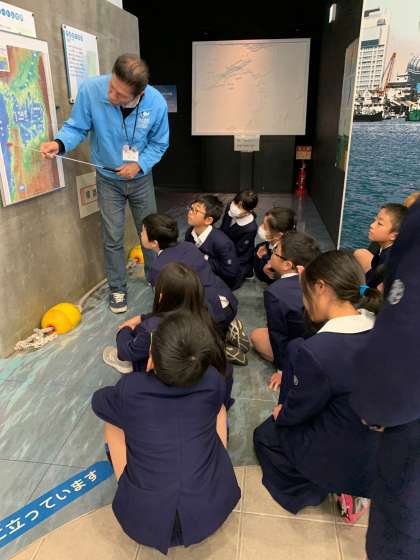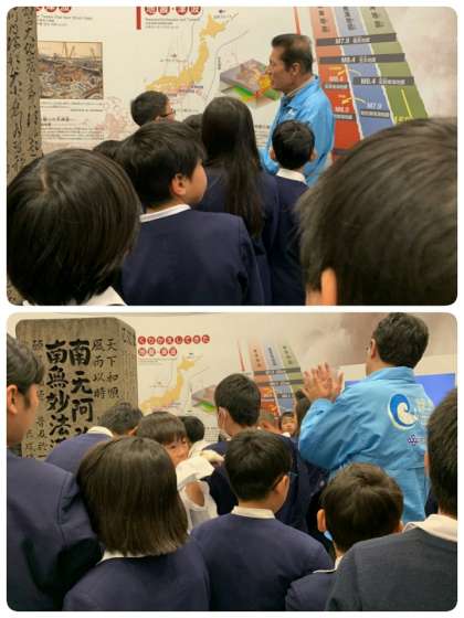 ここでは、かつて大阪を襲った高潮や、近い将来必ず大阪を襲うと言われている東南海・南海地震と津波について、また地震や津波発生時の対応などを学ぶことができます。子ども達は、話をよく聞き、熱心に見学しています。