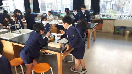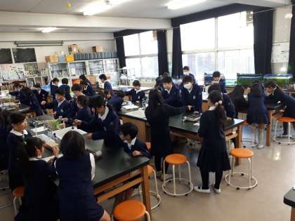 4年生が理科の実験を行いました。今までに行った実験で「空気と水は温度によって体積が変わる」ことがわかっています。今日の問題は「金属も温度によって、体積が変わるのだろうか」です。予想では意見が分かれていました。
