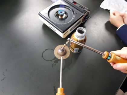 金属の玉と輪を使い実験をしたのですが、熱する前の玉は輪を通り、熱した玉は輪を通りませんでした。また、熱した玉を冷やすと再び輪を通りました。「手品みたい」と言っている児童もいました。