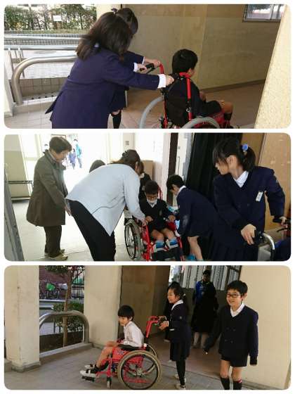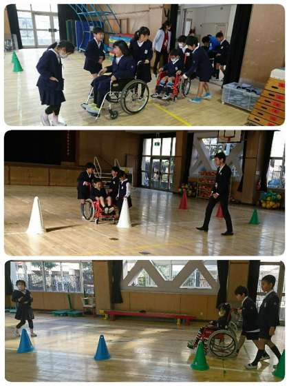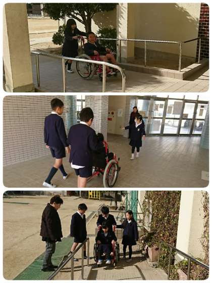 今日も住之江区社会福祉協議会(さざなみ)の方に来ていただいて、3−3の子ども達が「車いす体験学習」を行いました。グループに分かれて車いすに乗る人、車いすを押す人、周りをよく見て声をかける人など、役割分担して活動しました。スロープ(上り下り)、段差、障がい物など、みんなで考えて声をかけながらコースを回りました。どの子も真剣な顔をして体験学習に取組んでいました。貴重な経験になったことだと思います。