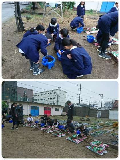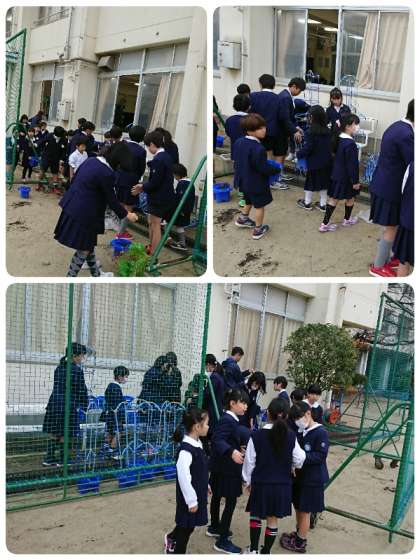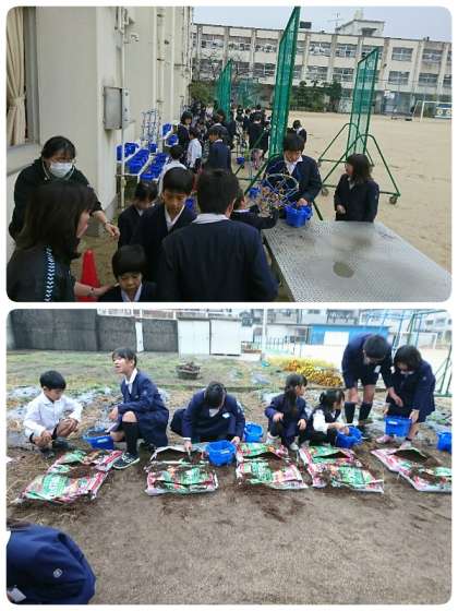 1年生が6年生に手伝ってもらって、チューリップの球根を植えました。アサガオを育てていた鉢の支柱をはずし、新しい土を入れて球根を植え、また植木鉢をフラワースタンドに戻すという作業です。6年生は1年生が上手にできるように見守りながらサポートしていました。例年6年生が卒業するころに色とりどりのチューリップが咲き始めます。これから1年生にしっかりお世話をしてもらいます。