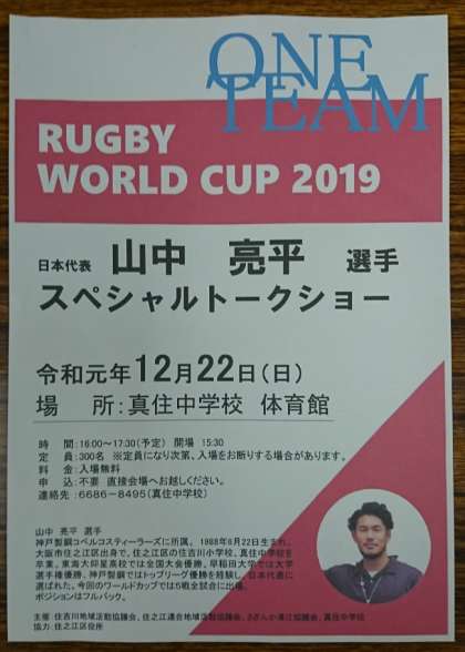 12月22日(日) 16:00〜17:30 真住中学校の体育館で、ラグビーワールドカップ2019 日本代表の山中亮平選手のトークショーが開催されます。会場が15:30で、定員が300名です。貴重な機会です。みなさんもぜひご参加ください。