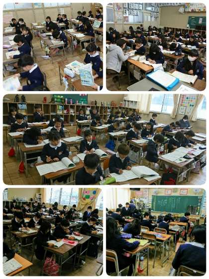 始業式の後、教室を回ると、ほとんどの学級で冬休みの宿題の答え合わせをしていました。どの学級も静かに落ち着いてできていました。その他、3学期の係活動の話し合いをしている学級や持ってきた作品を順に掲示している学級もありました。いよいよ明日から本格的な学習がスタートです。