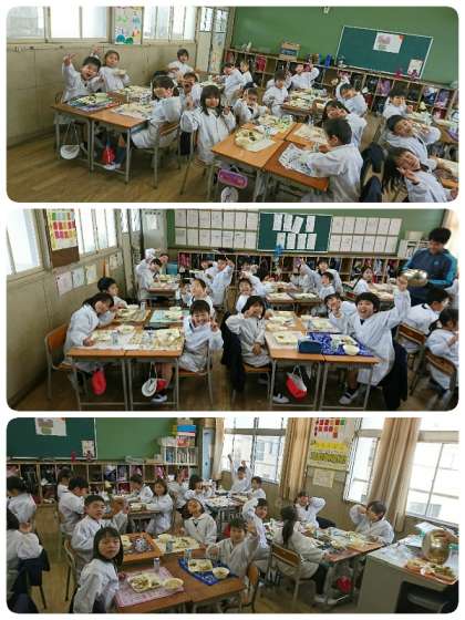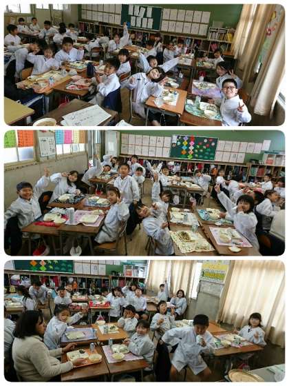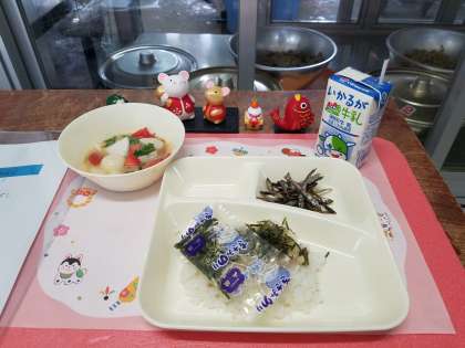 今日の給食は、「お正月献立」で、牛乳、れんこんのちらしずし(ご飯減量)、ぞう煮、ごまめでした。れんこんのちらしずしは、れんこんや豚肉、三度豆、コーンなど具だくさんでした。ぞう煮は、白玉もちが子ども達に好評でした。ごまめは、かりっとしていておいしかったです