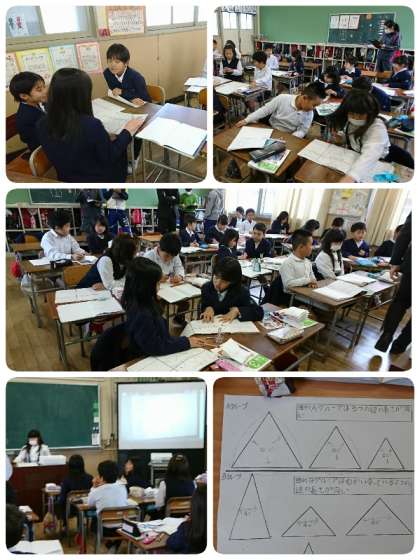 「辺の長さがすべて等しい」「2つの辺の長さが等しい」「3つの辺の長さがすべて違う」というグループに分けることができました。ワークシートには、自分で同じ長さの辺がわかるように自分で工夫している子どもがいました。(素晴らしい!!(*^^)v)