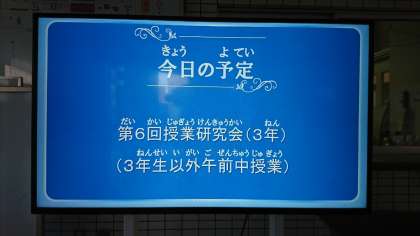 5時間目に3−3で授業研究会を行うため、3年生以外の学年は、給食・清掃終了後、13:30〜13:40に下校します。ご予定よろしくお願いします。
