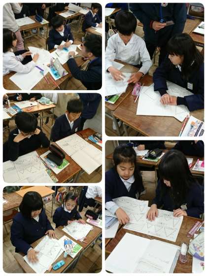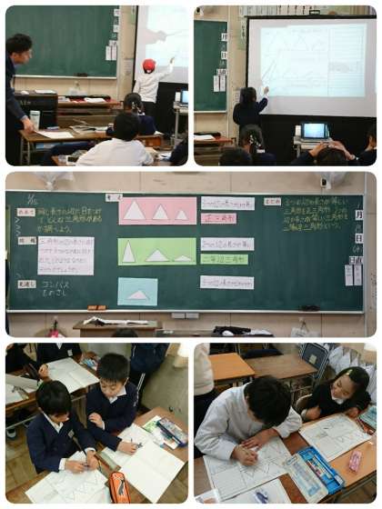 ペアでの意見交流も慣れたもので、自分の考えをみんなが伝えることができていました。後は、人の意見を聞いて自分の考えをどうやって深めていくかが課題です。今日の学習では、三角形の中には、正三角形・二等辺三角形があり、それぞれの定義もわかりました。振り返りカードには、〇や◎が並んでいました。自分でがんばった・よくわかったと子ども達が評価した結果です。本当によくがんばっていました。今日も花丸です。