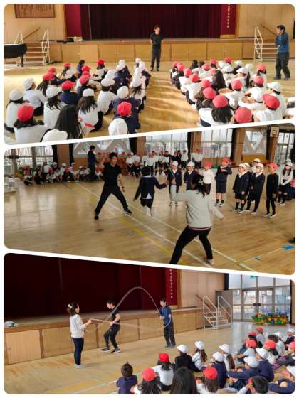 今年度も日本ダブルダッチ協会公認インストラクターの大島稔史さんに出前授業に来ていただきました。大島稔史さんは2016年世界大会の優勝経験もある方です。