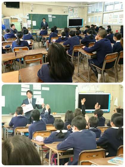 消費税・所得税・法人税などいろいろな種類の税があることや税は世界で50種類ぐらいあること、国によって様々な種類の税があることなど、クイズをしながら教えてもらいました。子ども達も真剣に聞いていました。後で、教えに来てくださった方から授業態度をほめていただきました。