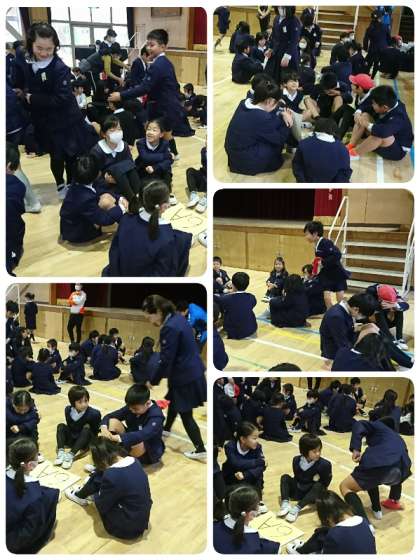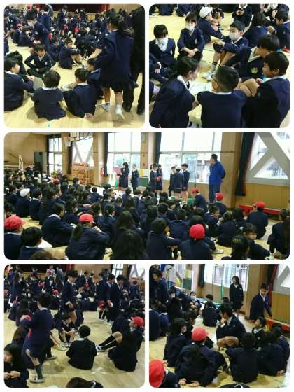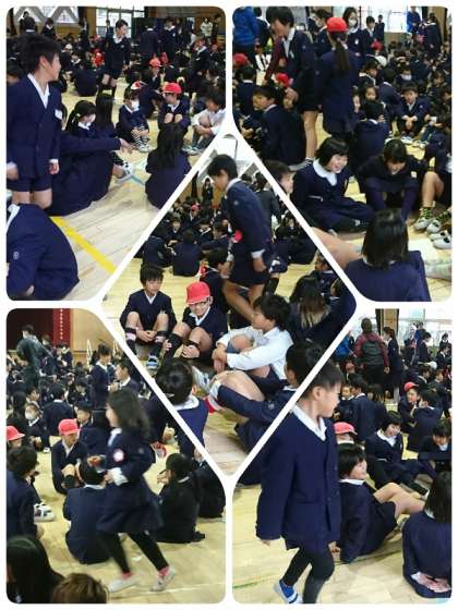 今日の児童集会は、「帽子落とし」でした。ルールはハンカチ落としと同じです。たてわり班ごとに円になりスタート。下の学年の子ども達が逃げる時には、上の学年の子ども達は上手に追いかけるようにしながらもタッチしないで、楽しそうに遊んでいます。学年が近い場合は本気モード。みんなで仲良く活動していました。たてわり班で活動することで、子ども達の優しい気持ちが育っています。
