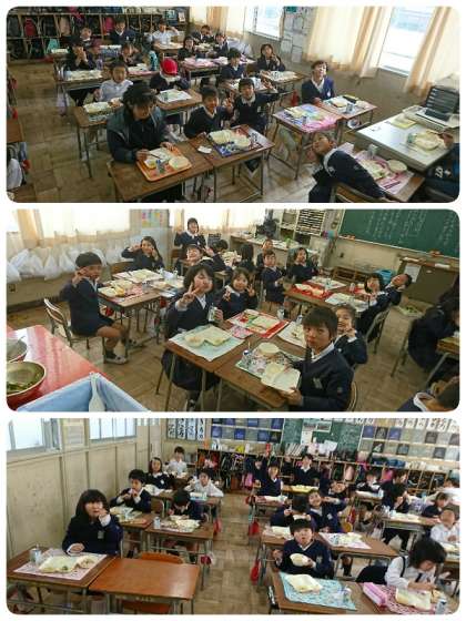 今日の給食は、牛乳、ごはん、かす汁、ブロッコリーのしょうがづけ、くりきんとんでした。かす汁は、ほんのりと酒かすのにおいが香り、野菜もたっぷりと入っていて良かったです。ブロッコリーのしょうがづけは、しょうがと醤油の味付けがよく、子ども達に好評でした。くりきんとんは、甘くておいしかったです(*´▽`*)