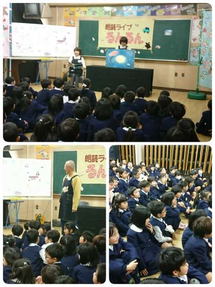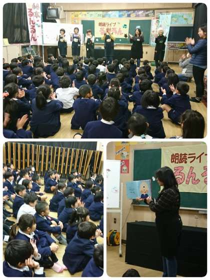 今日は、1・2年の本の読み聞かせに「るんるん」のみなさんが来てくださいました。