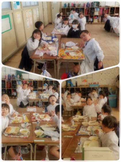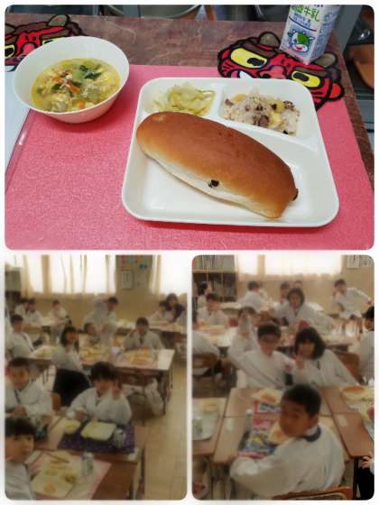 今日の給食は、牛乳、レーズンパン、中華おこわ、卵スープ、キャベツのオイスターソースいためでした。中華おこわは、中に入っているくりが人気でした。卵スープは、チンゲン菜やもやしがシャキシャキとした食感でよかったです。キャベツのオイスターソースいためは、子ども達に好評でした!(^^)!