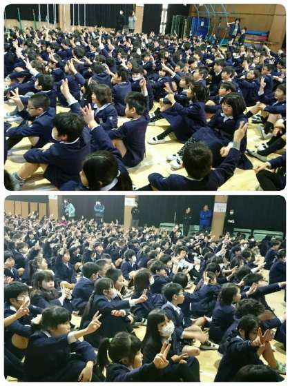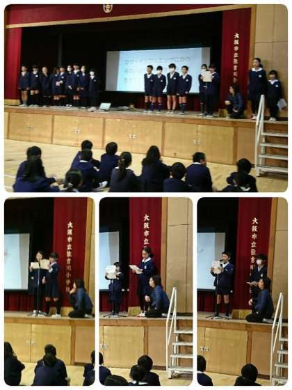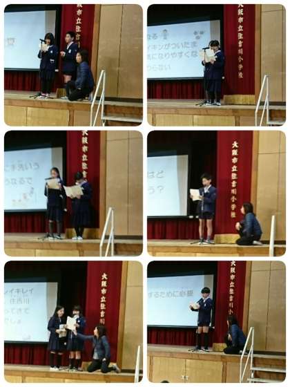今週の手洗い・うがい週間の取組の一つとして、今日の児童集会では、保健委員会の発表がありました。かぜやインフルエンザ等の予防の仕方について、クイズを出してみんなで考えました。