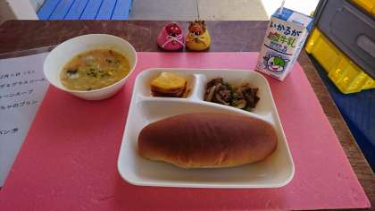 今日のメニューは、牛肉のデミグラスソース煮は、牛肉と玉ねぎの旨味とデミグラスソースが相まってとてもおいしかったです。子ども達も「おいし〜!!」と言ってパクパク食べていました。コーンスープは、コーンの甘みがあり、他の野菜もたくさん入っていておいしかったです。かぼちゃのプリンは、甘さ控えめでした。黒糖パンもほんのり甘くて子ども達が大好きなパンのひとつです。今日もおいしくいただきました。