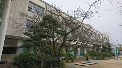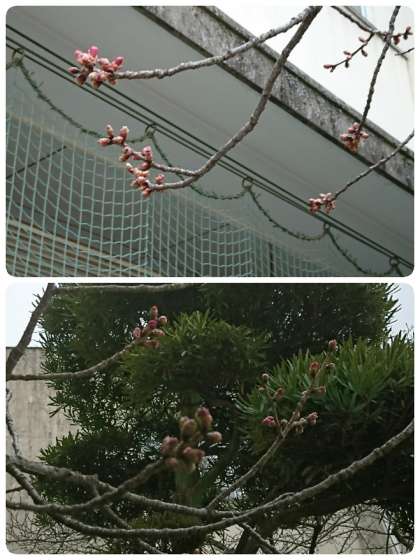 理科室前のカンヒザクラのつぼみが、昨日で一気に膨らみました。つぼみの先から濃いピンク色の花びらが少しのぞいています。花が咲いたら、毎年野鳥が集まってきます。またホームページでお知らせしますね。