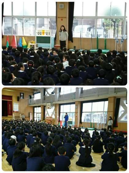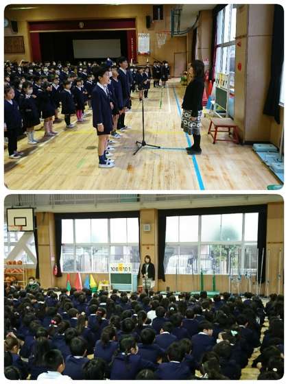 さて、今、毎日のように新型コロナウイルス感染症のニュースが報道されていますね。みなさんもニュースを見て、不安になっている人もたくさんいると思います。先週は1−1が学級休業をしていて、今日からまた全員そろいましたが、感染症には、みなさんもよく知っているインフルエンザや感染性胃腸炎等、いろいろな種類があります。それらを予防するためにみなさんに気をつけてほしいことを3つお話しします。まず1つ目は、手洗いをしっかりすることです。家に帰ったとき、食事の前、トイレや掃除の後など、こまめに手洗いをしましょう。手のひらや手の甲だけでなく、指と指の間もしっかり洗いましょう。2つ目は、十分な睡眠をとって、しっかり食べる等、規則正しい生活をして、日頃から免疫力を高めておくことです。3つ目が、咳エチケット。咳やくしゃみが出る人は、マスクをつけましょう。咳やくしゃみをするときは、人のいない方を向いてしてください。今、マスクを買いに行っても、売り切れていて、なかなか手に入らないので困っていますが、マスクをしていないときに急に咳やくしゃみが出るときは、ハンカチやティッシュで、それも間に合わないときは、そでの内側で口と鼻を押さえましょう。感染症を予防するために、みんなで気をつけて生活していきましょうね。