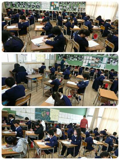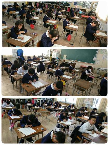 「始め。」の放送で、一斉にスタートしました。漢字の「とめ」「はらい」「はね」などを意識して、ていねいで分かりやすい文字を書くことが約束です。どの教室に行っても、子ども達は集中して漢字検定に取組んでいました。早々と書き終えて見直しも終わり、裏のマスに今まで習った漢字を書いている子どももいました。