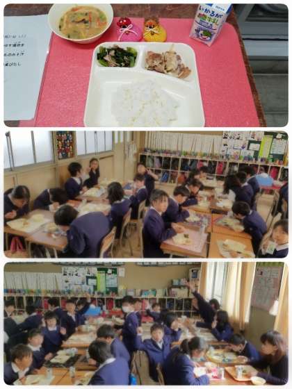 今日の給食は、牛乳、ごはん、鶏肉のゆず塩焼き、さつまいものみそ汁、こまつなの煮びたしでした。鶏肉のゆず塩焼きは、ゆずの風味が効いていて、玉ねぎとの相性もよく、おいしかったです。さつまいものみそ汁は、さつまいもがホクホクして、とても甘かったです。こまつなの煮びたしは、豚肉も入っていて、アクセントになっていました(*^^)v